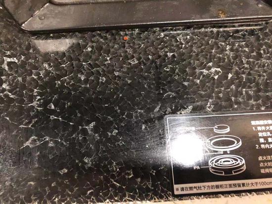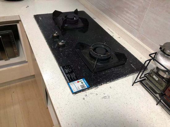 从赵先生提供的照片可以看到,燃气灶的玻璃面板表面出现大量裂纹,燃气灶边角位置还有玻璃碎渣飞溅而出,散落在周围的厨房台面上。