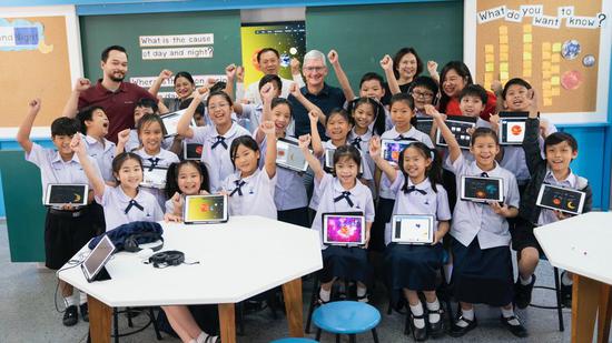 在参观了黎明寺之后,库克前往Satit-Chula学校,在苹果“每个人都可创造”课程中与学生会面,该课程使教师可以将iOS设备上完成的绘图,音乐,电影制作或摄影功能集成到他们针对各种主题的课程计划中。