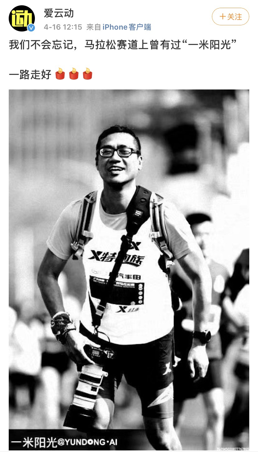 马拉松赛道摄影师“一米阳光”跑步时突发心梗去世。