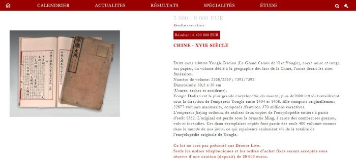 《欧洲时报》称,当时竞拍价已经突破拍卖公司显示屏的极限,竞拍价无法显示。经过11分钟的竞拍,拍品最终由现场的一位中国女士以640万欧元的竞价拍得,比起拍价溢价了超过1200倍。由于拍卖行佣金为27%,两册《永乐大典》最终成交价为8128000欧元(合近6500万元人民币)。