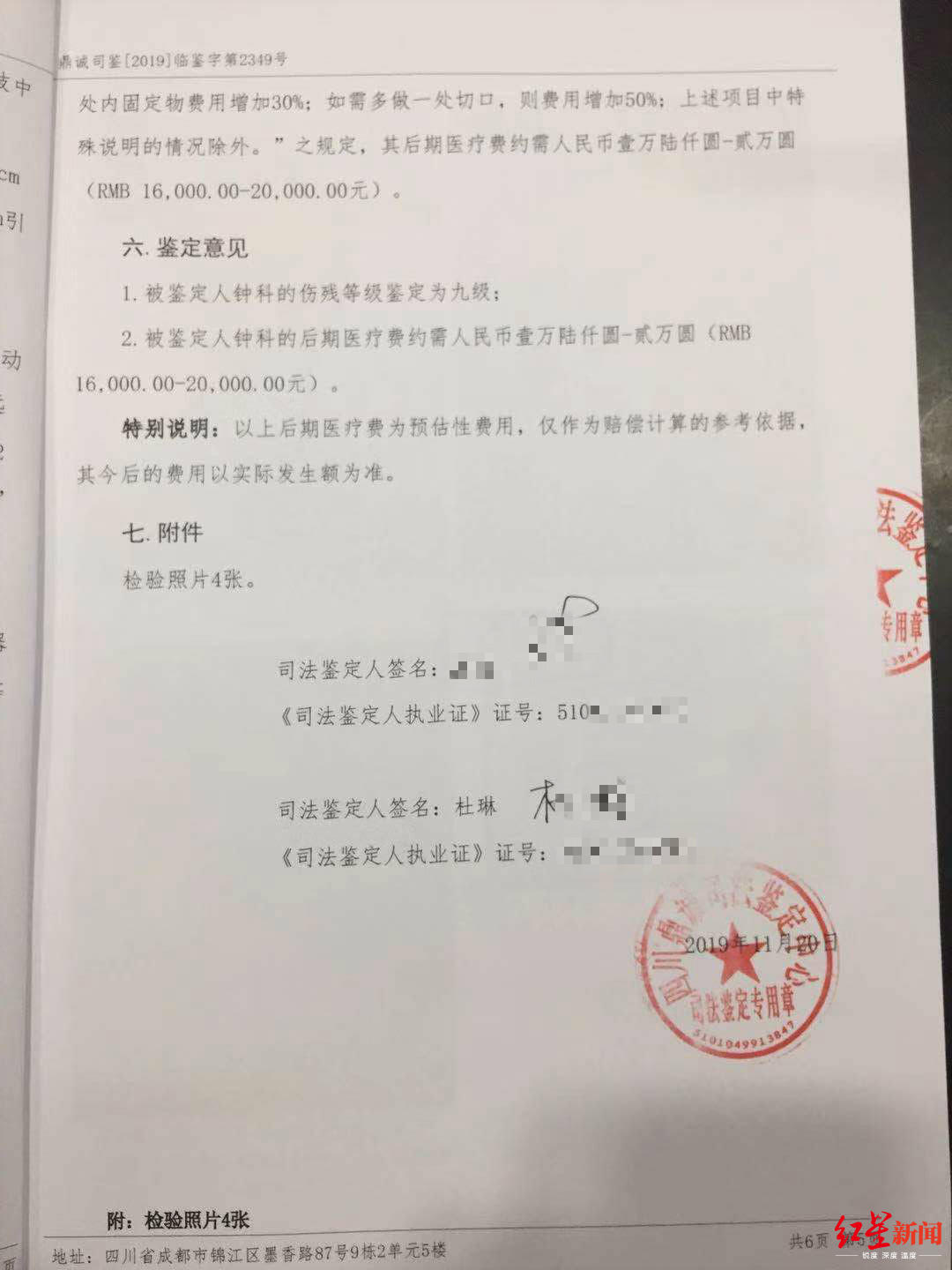 11月20日,四川鼎诚司法鉴定中心出具司法鉴定意见书认定:被鉴定人钟科的伤残等级鉴定为九级;后期医疗费约需人民币16000~20000元。