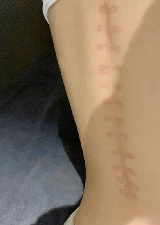 三块钢板和数枚螺钉植入她的身体中,在左右脚踝各自留下一处L形疤痕。后背到腰部的手术痕迹更明显,是一条沿着脊柱竖直、约为20厘米的刀口,每隔一段就有一条短横的缝合痕迹,就像是冬天女孩们常穿的牛角扣大衣全部系上的样子。