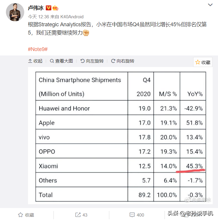 多家市场调研机构陆续公布2020年第四季度智能手机市场报告,小米集团副总裁、中国区总裁、红米Redmi品牌总经理卢伟冰分享Strategic Analytics最新报告,2020年第四季度,国内智能手机市场同样迎来不小变化。