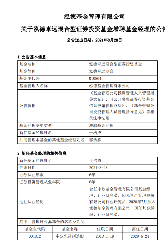 基金君查阅了一下,8月28日,泓德卓远确实发布过公告,增聘增聘基金经理于浩成,与邬传雁一起共管。