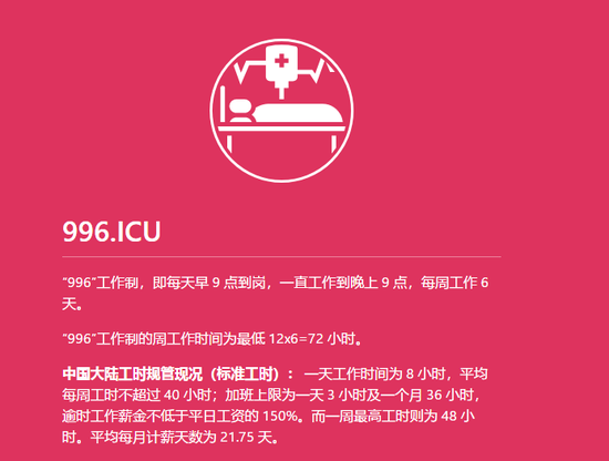 3月27日,一个由程序员发起,名为“996.ICU”的域名上线,受众可以添加自己所知道的公司加班情况,阿里、京东、华为等均榜上有名。网站发起者还帮996的员工们算了一笔经济账,按照劳动法规定,996工作制下只有拿到当前工资的2.275倍,才在经济上不吃亏。这个网站被发在GitHub一个小时之后,标星就超过了1000。随后关于“996工作制”的讨论逐渐升温,一度登上微博热搜,尽管随后马云表示“不为996辩护,但向奋斗者致敬”,但相关话题仍保持较高热度。