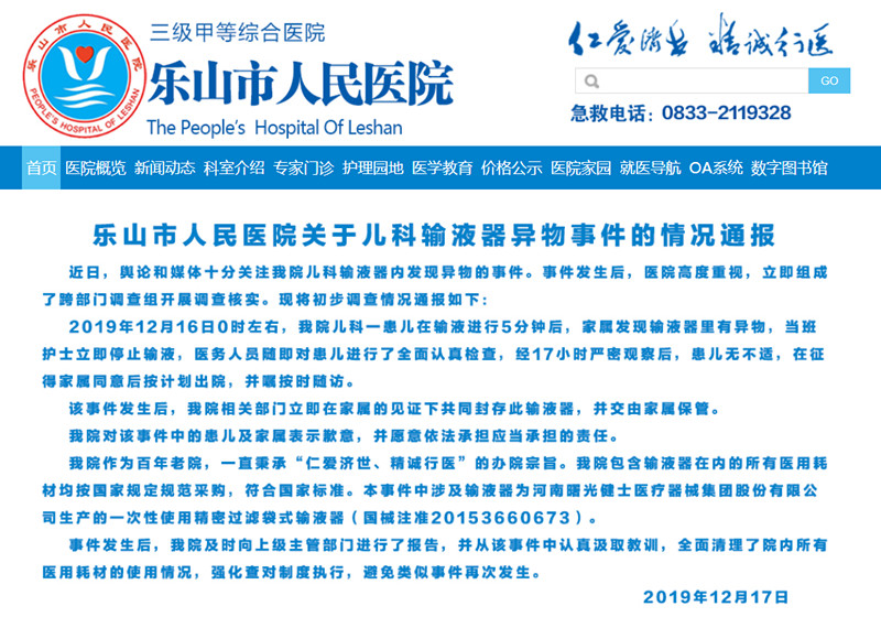 中新经纬客户端12月18日电(高晓锳)据红星新闻报道,近日,四川乐山一名3岁幼儿在输液5分钟后发现输液管中有虫,该视频在网上迅速扩散,视频中输液管中的“虫子”清晰可见。据17日乐山市人民医院官网通报显示,该院相关部门立即在家属的见证下共同封存此输液器,并交由家属保管。同时,通报了本事件中涉及的输液器为河南曙光健士医疗器械集团股份有限公司(下称:曙光健士集团)生产的一次性使用精密过滤袋式输液器(国械注准20153660673)。