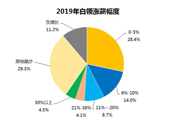 调查显示,合计59.6%的白领表示在2019年实现了不同程度的涨薪,涨薪幅度在5%以内的白领最多,为28.4%。29.3%的白领薪酬“原地踏步”,11.2%的白领薪酬“负增长”。