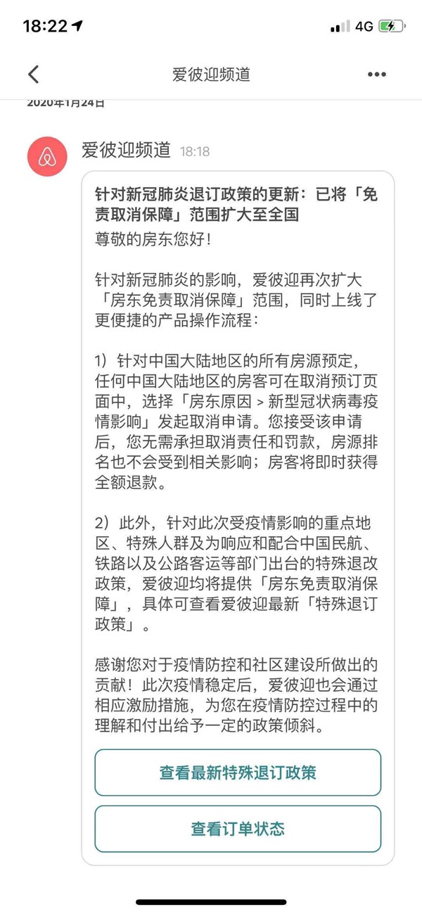 1月24日,爱彼迎退订保障再次升级,将房源免费取消的范围从武汉市扩大到了湖北省,并将订单时间从1月31日延长至了2月8日。