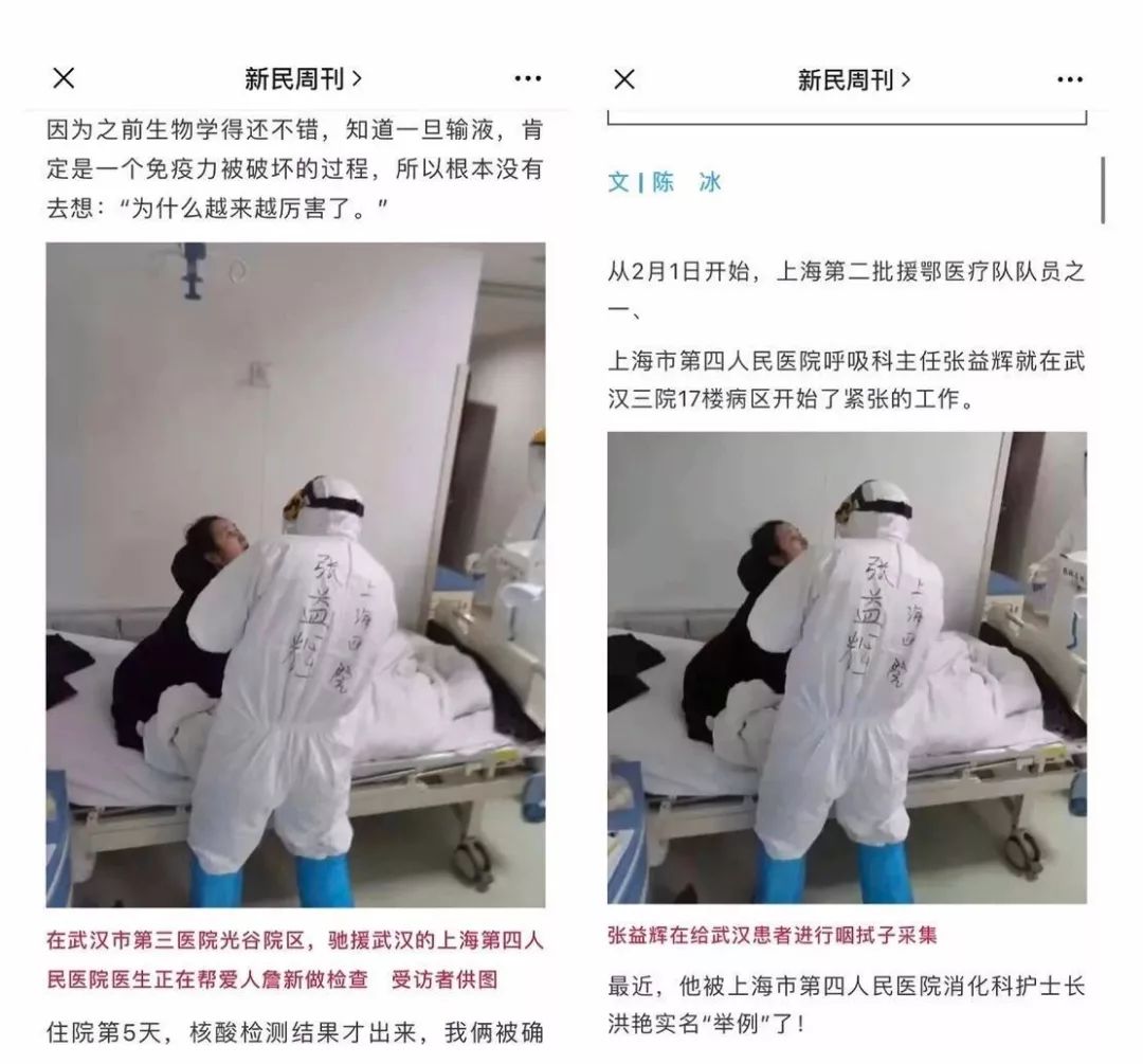 在2月10日刊发的《口述实录|“只要我俩有一个活下去,5岁的女儿就不是孤儿”,我靠这个信念支撑到胜利》一文中,一张上海四院张益辉给武汉患者进行咽拭子采集的照片,与另一篇文章《被实名“举例”的最美逆行者》无缝衔接。