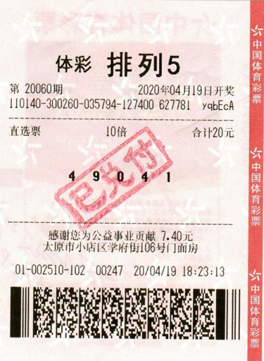 2020年4月19日,体彩排列五第20060期开奖,开奖号码为:“4 9 0 4 1”,全国共开出60注一等奖,单注奖金10万元。我省共中出11注排列五一等奖,其中太原购彩者喜获10注一等奖,收获奖金100万元。