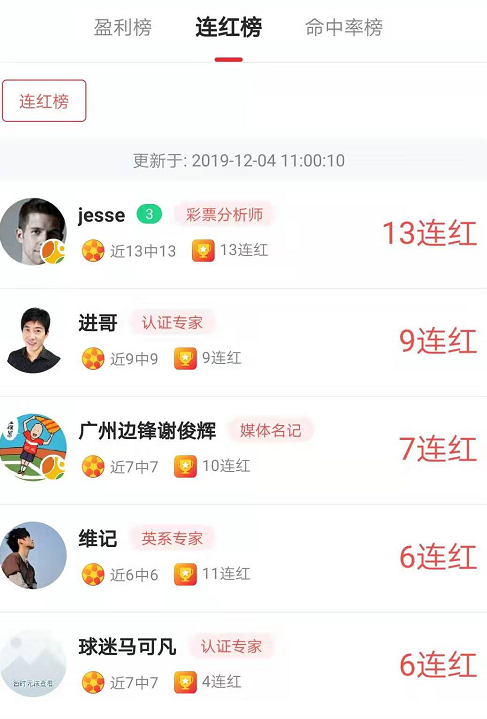 连红榜上,专家Jesse13连红排名第一,进哥9连红位列第二、广州边锋谢俊辉和球迷马可凡达到7连红!