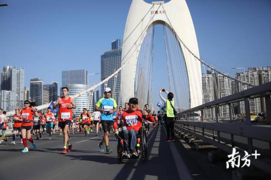奔跑着,他感受着城市的脉搏。比赛开始后1个半小时,他跑到了猎德大桥。珠江水波光粼粼,四周有摩天大楼的高速电梯,脚下是大约2分钟一班的地铁。这一切,让他感受到城市的生命力。