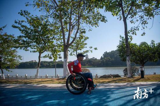 赛道上,轮椅是他最好的伙伴。“跑”完一公里只需要4分钟,同行者往往需要快走甚至跑步才跟得上他。常年的锻炼让他上肢力量强大,可熟练地把轮椅前端翘起,摆出半悬空的姿势。转眼,这个纤维轮“跑鞋”已陪伴他4年。