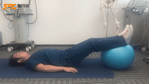 ◆平躺在软垫上,可以在背部放一个泡沫轴增加难度,双脚搭在瑜伽球上,练习腰椎的稳定性。