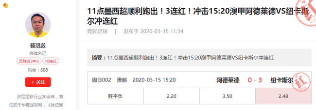 昨日竞彩涉及两场澳超,不少专家都拿到了两场全红的成绩。近期五大联赛相继停摆,小联赛却仍不减火热,昨日杨冠彪2单全红净赚231%位列第一,专家胡志军连续两天4场澳超全红更是位列3日盈利榜第一![查看全部权威球通专家]