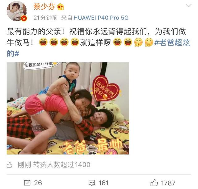 像蔡少芬就晒出了老公张晋跟孩子们在一起的照片,更直言张晋是最有能力的父亲,一直背着家庭,为我们做牛做马,在照片中,蔡少芬也是第一次曝光自己小儿子正面照。照片中几个孩子跟张晋十分的亲密,几人都压在张晋身上也是呼应了蔡少芬那句“永远背起我们”。