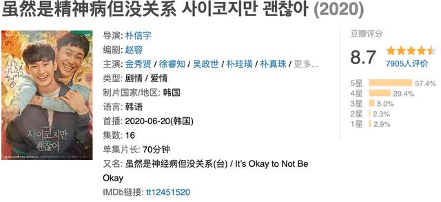 金秀贤主演的电视剧《虽然是精神病但没关系》(话说现如今的影视作品翻译剧名都是直译吗?),于TVN电视台在上周末(6月20日)开播,周六、周日连续两天的收视率蝉联了付费平台的收视冠军。不仅仅是该剧的收视非常好,其电视剧本身也是受到了很好的评价,在国内的豆瓣评分网站上获得了8.7的高分。