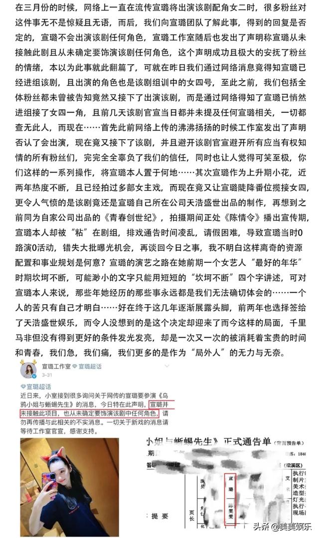 可近期却得到了宣璐在该剧中饰演女四号的消息,之前声明没有的事情在悄悄运营,这才是最让粉丝生气的。