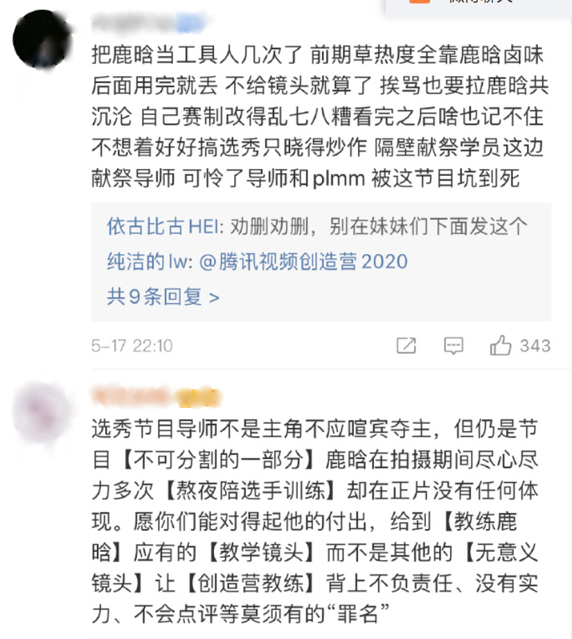 而导致导师表现不佳的原因,从近期鹿晗粉丝不断在官微控评声讨来看,他们认为是节目组的剪辑问题。有了解详细情况的粉丝表示,鹿晗在录制期间曾连夜辅导学员,但节目组并没有在正片中有所体现,而是给到了其他“无意义”的镜头,从而使得“创造营教练背上不负责任、没有实力、不会点评等莫须有的‘罪名’”。