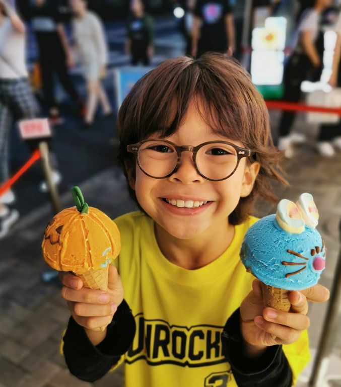 戴上眼镜的小王子,也是非常可爱童真,凸显出他的迷人魅力。这次他身穿一款荧光黄色的T恤,叠穿上简约的黑色打底衫,这样的一身造型很时尚,虽然年龄不大,但是穿搭还是很时髦的,长大后肯定是不得了的。手持两个卡通甜筒,更加凸显了小王子的童心满满呀。不知道你们是否也觉得吕燕的儿子长相很可爱呢?欢迎留言分享哦。