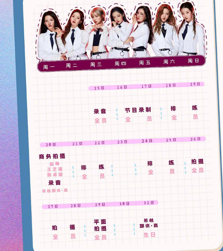 除了要排练和录音以外,我们也可以看到有个别成员是有单独活动哒,这些有单独的专属活动的成员还刚好是《创造营3》比赛中的前四名呢!赵粤、王艺瑾、陈卓璇获得了商务拍摄的资源,而希林娜依高则获得了单独录音的机会。