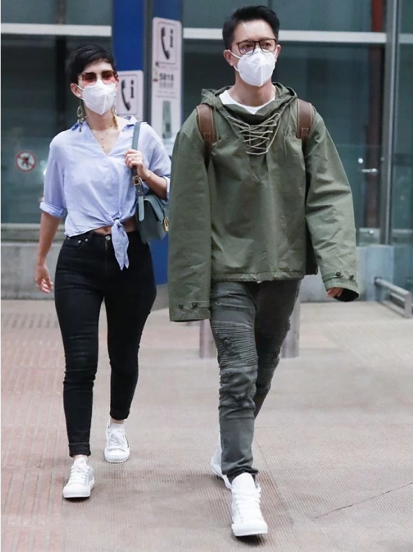 而走在一旁的老婆卢靖姗留着清爽的短发,上身穿着已经一件蓝色的露脐装,下身穿着黑色紧身裤,值得一提的就是两人都穿着同样的小白鞋,也是暗戳戳地在秀恩爱。