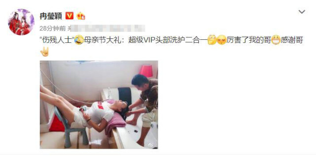 5月11日,冉莹颖通过社交平台分享了一张邹市明为她洗头发的照片,还配文和粉丝们互动:“伤残人士”母亲节大礼:超级VIP头部洗护二合一,厉害了我的哥,感谢哥。 如此花式秀恩爱的方式,实在是有点让人甜的上头了。