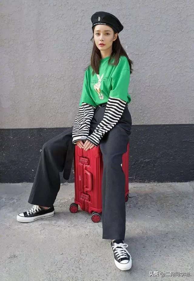 绿色的拼接长袖上衣搭配黑色的阔腿裤,头戴黑色贝雷帽,脚踩黑色帆布鞋,这是很亮眼的街拍造型,非常吸睛。上衣的袖口拼接了黑白的条纹设计,更有层次感,颜色吸睛亮眼,很小清新的搭配。