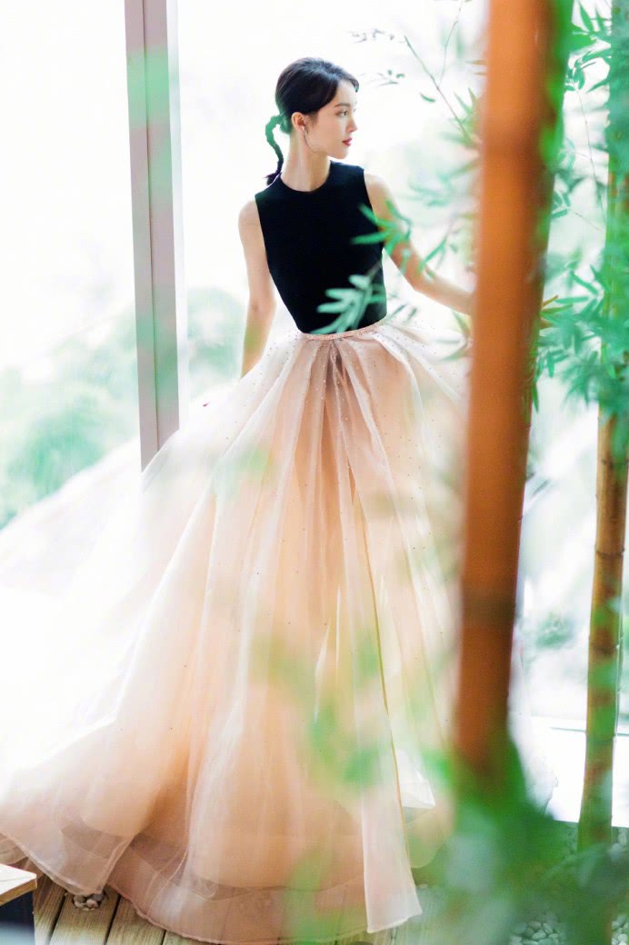 金晨扎起了一条蜈蚣辫,俏丽无比,一件黑色无袖衫穿在身,秀出纤细的双臂,搭配上裸粉色半裙,宽阔的裙摆看起来非常大气!