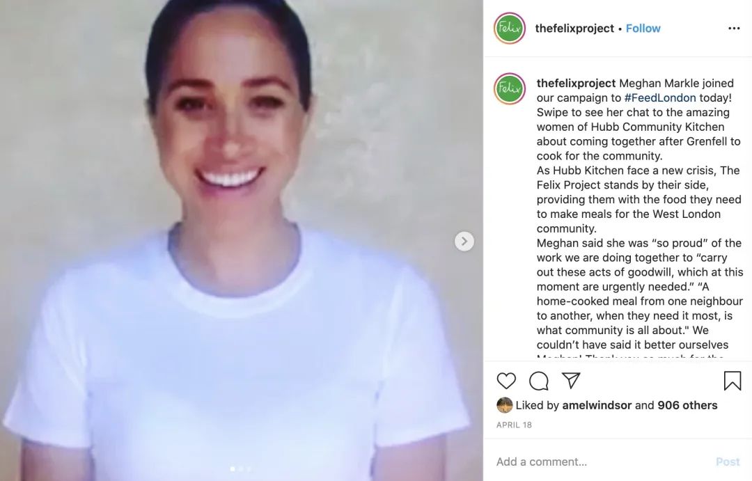 夫妇俩自己的官方IG账号虽然鲜有动态更新,但我们时不时能够从慈善机构的账号里看到夫妇俩的身影。除了开头的Save with Stories项目外,梅根还出现在了The Felix Project的IG账号中,这是一个专门将卖不出去的新鲜食物送给有需要的人们的慈善组织。