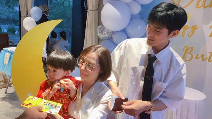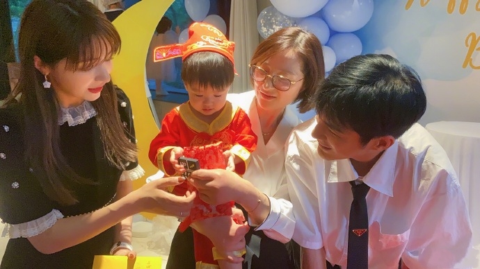 姜潮开心地发文说:借儿子生日,和老婆过个节,儿子的抓阄我是没有看懂的,千万不能像他爸一样成为万人迷。健康快乐长大吧!你好好长大,我继续年轻。而麦迪娜随后也发文称:节日很开心,生日快乐我的宝贝。爸爸妈妈希望你开开心心的长大。