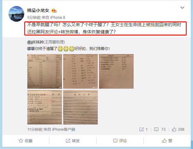 5月18日晚,经历了整整两天多的时间,王雨馨终于清醒,没有了生命危险,相信此刻的她才知道生命的可贵吧。从5月16日早上八点自杀未遂后住院,截止到今天中午王雨馨助理还在社交平台上发文谴责黄景瑜方,称黄景瑜方没有一点良知反倒是处处为小三洗白。