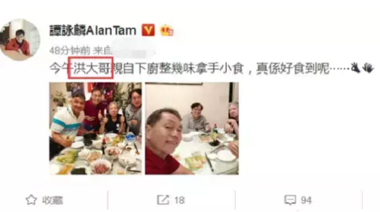 洪大哥自然就是洪金宝了,但是当我们看谭咏麟配的两张照片的时候,猛地一看还真的没有认出来洪金宝,尤其是谭咏麟发的第一张照片,坐在大家中间,两个手都竖起大拇指的老人……竟然是洪金宝。