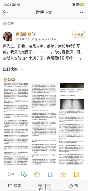 每年5.19号的时候,伊能静都会写一篇长文,为自己的老公秦昊庆祝生日。但是今年确实个例外,直接翻出往年的文字截图凑数,让秦先生先凑合看,因为实在太累要先睡觉,等睡醒了在写新的。秦昊也是怪淘气的,微博留言说“说好的小作文呢?在线等~”,伊能静回复说“明天七点排练,我中午吃饭给你写哈”。要不要这么甜蜜,累成这样还不忘撒把狗粮。