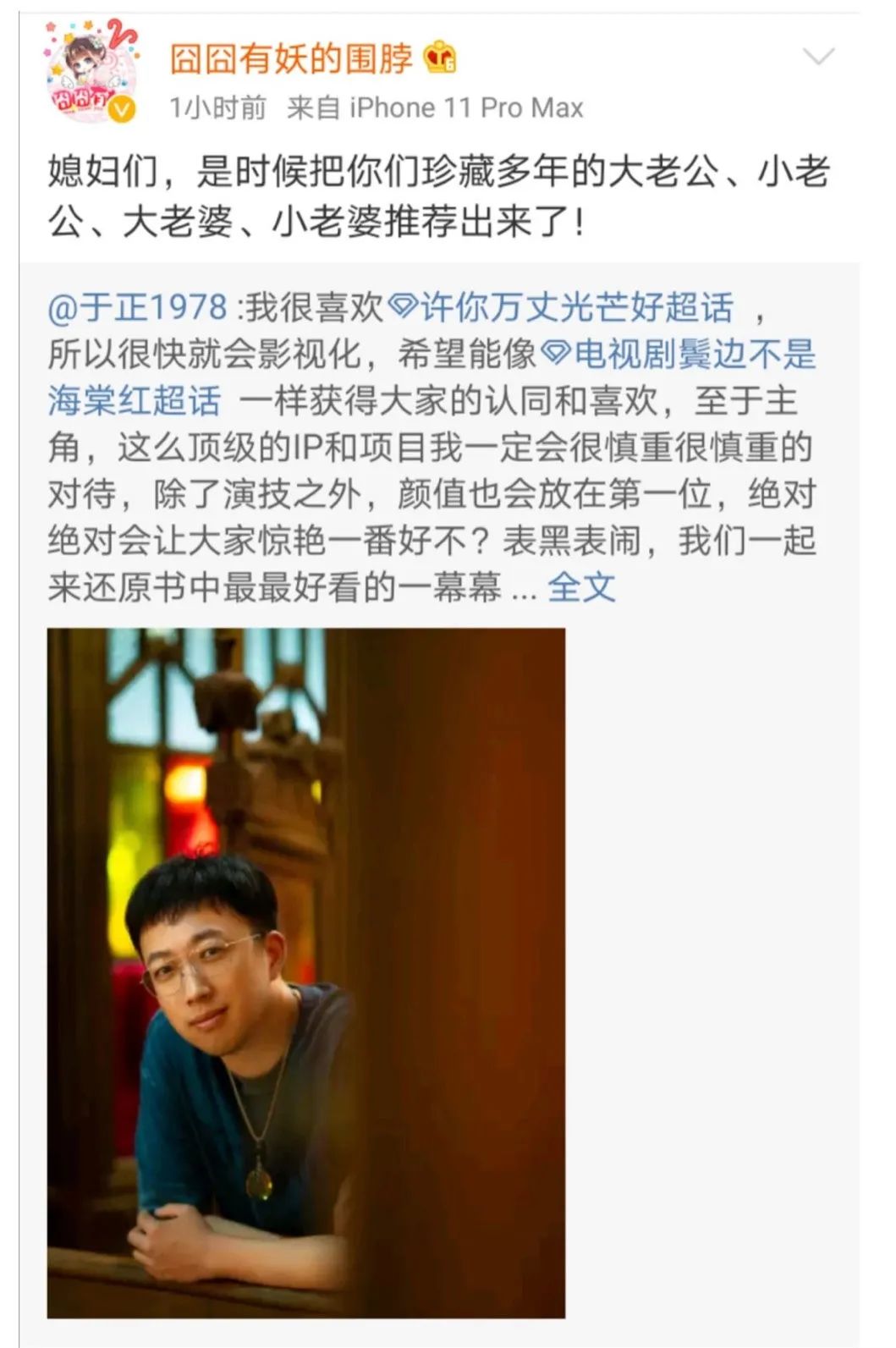 近日,于正发微博宣布小说《许你万丈光芒好》即将影视化,请网友推荐主演。《许你万丈光芒好》是囧囧有妖所著豪门总裁甜宠文,主角为宁夕、陆霆骁、云深、江牧野。