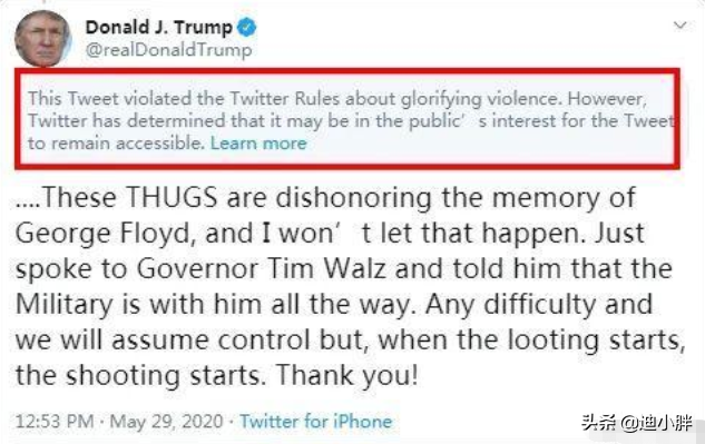 值得注意的是,特朗普这条推文发出后不久,就连社交媒体平台也盯上了他。他的这条推文被推特 警告 为 “违反有关美化暴力的社区规则”,但出于“公众利益”没有被删除,而是被设置为点开可见。同时,该推文的点赞、评论与转发功能也已经被禁用或限制。