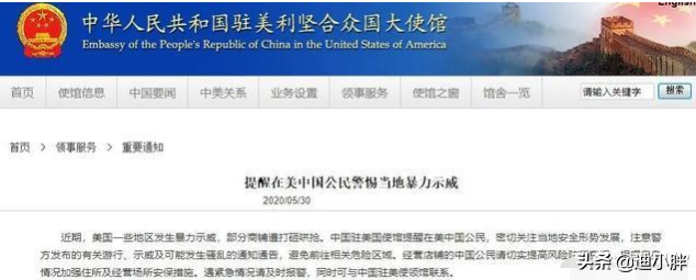 中国驻美国使馆提醒在美中国公民,密切关注当地安全形势发展,注意警方发布的有关游行、示威及可能发生骚乱的通知通告,避免前往相关危险区域。
