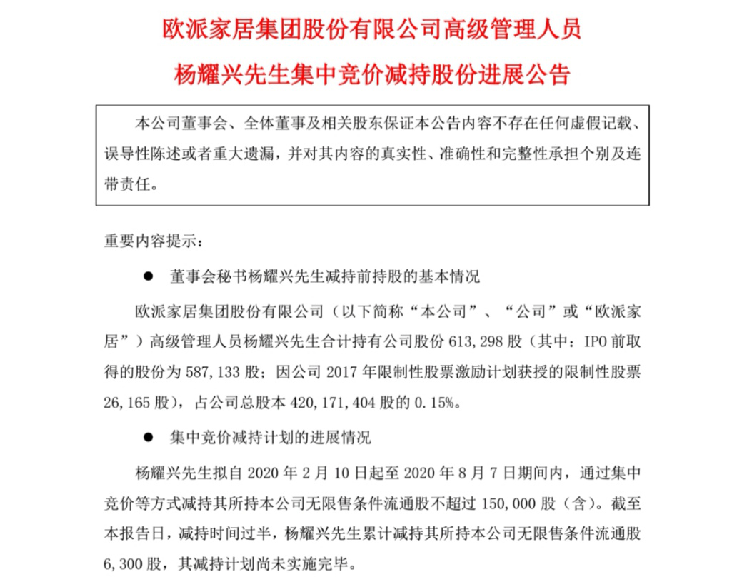 根据公告显示,欧派家居称公司高级管理人员杨耀兴自2020年2月10日起至2020年8月7日期间内,通过集中竞价等方式减持其持有欧派家居无限售条件流通股不超过150000股(含)。
