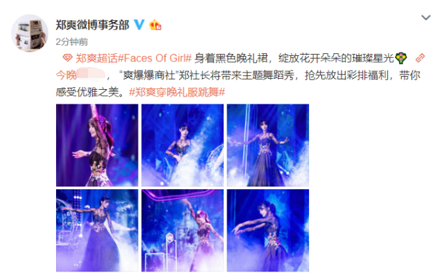 5月31,郑爽工作室晒出一组爽妹子最新节目写真。照片中,郑爽头扎马尾身穿黑色花朵礼服,于雾气中随音乐翩翩起舞,整个人优雅仙气十足!