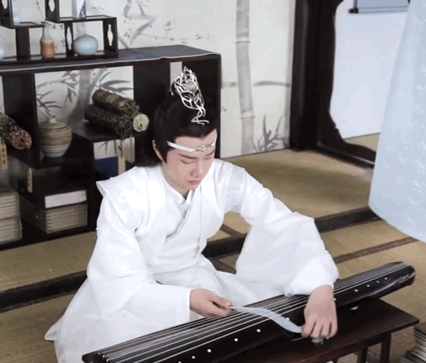 演弹琴的时候,剧中又冷又酷,但实际上在拍摄休息的时候,王一博是这样的↓