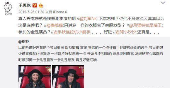2015年,《中国好声音》播出的时候,有网友发现选手在唱歌的过程当中,导师的发型一会是直发一会是卷发,王思聪看见了直接转发了微博, 把真人秀按照剧本演的事情直接就说了出来。