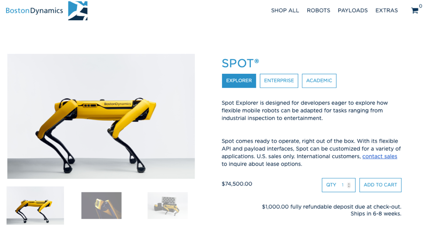 这钱花的,是不是还挺值?美国时间6月16日起,登陆波士顿动力官网,直接下单,6~8周后,风靡全球极客圈的那只机器狗,就会乖乖躺在你家门口。而且,每人限购两只,先购先得。