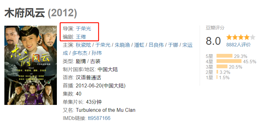 虽说于荣光当导演后也制作过像《木府风云》《舞乐传奇》这样口碑不错的电视,但也与编剧王倦的实力脱不了关系。