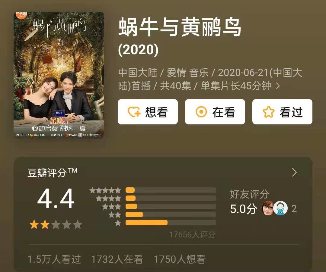 6月份播出的《蜗牛与黄鹂鸟》是日剧《交响情人梦》的翻拍版。但《交响情人梦》无论是动画版还是真人版,最低分也有8.5。只有4.4分的《蜗牛与黄鹂鸟》,就成了妥妥的“毁经典”之作。