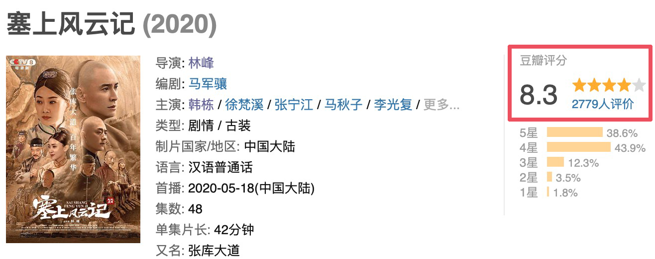 《塞上风云记》的男主是韩栋,女主是徐梵溪,老戏骨有李光复、李立群、臧金生、杜玉明、倪大红、刘佩琦等,从演员阵容看就是大阵仗,所以就冲这些好演员,目前的评分和口碑是没毛病的,但问题也在这里,好评率基本都是靠演员演技支撑, 尤其是男主韩栋。