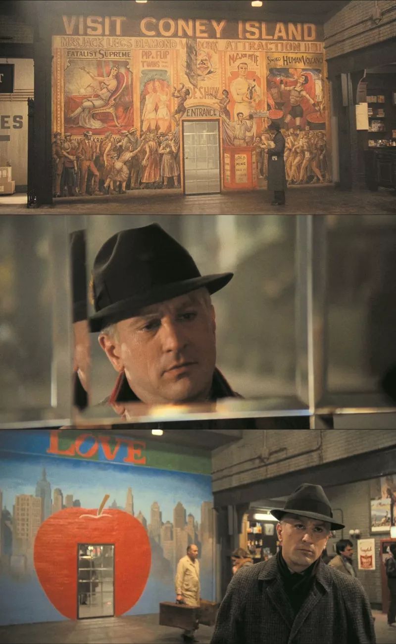 另一处转场异曲同工:青年面条凝视画着康尼岛的车站入口——镜头推近门上的镜子——镜子中映出已经苍老的脸——老年面条转身——镜头拉远,还是那扇门,但当年的宣传画早已换成“大苹果”招贴——披头士的《Yesterday》奏响。