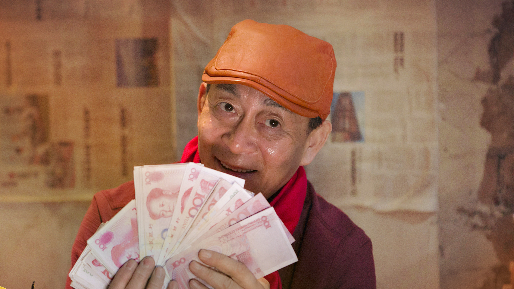 接着继续靠旁白推动剧情,女儿出国工作,老爸偶然发现十年前买的股票赚了两千万。一向爱数钱的郝鲲鹏,去银行取出了所有的钱,放在家里天天数着玩。
