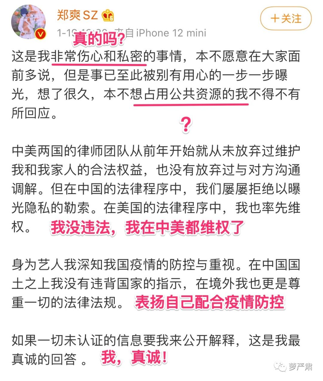 郑爽和爽爸发文的共同点是表达效率极低,滴滴拉拉说了一堆却没有重点。他们的大动作选择在晚上,可以说是完全不考虑媒体的心情。跑题一下,想想当年李雨桐和薛之谦battle的时候,李雨桐文通字顺证据确凿表达铿锵有力不说,连发布大锤的时间都知道避开节假日。而大花公布重要消息都是在工作日上午十点,多么体贴。所以非迫不得已的的突发事件,在非工作时间,憋着发微博搞事情的明星,前途有限也很正常。