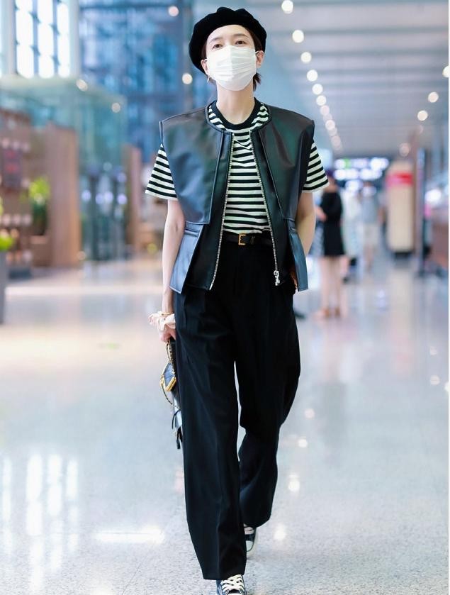 纯粹单一风格的造型穿搭太过于基础,其实很难给人一种独特的创意感,但如果选择不同风格单品进行混搭,就会让整个造型变得特别而又吸睛。这身造型中的马甲是一款较为干练的皮马甲,而内搭则是略带复古的条纹内搭,二者相互碰撞则让整个造型变得非常特别与吸睛,进而令整体看起来非常的别致时髦。