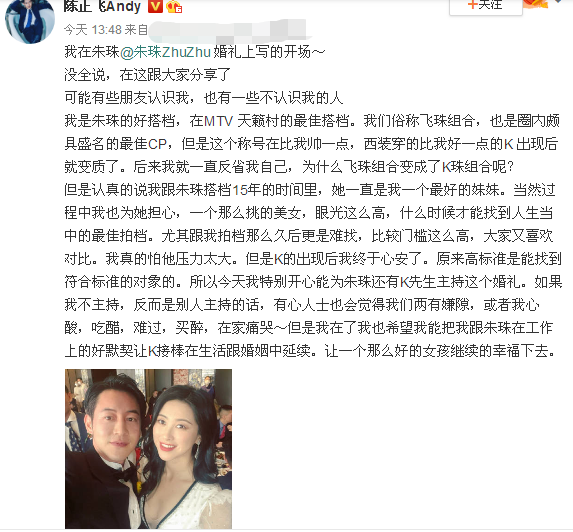 3月18日,MTV主持人陈正飞在社交上分享了朱珠的结婚现场,并晒出了自己写给朱珠婚礼的完整版开场白。